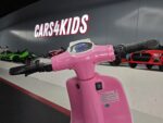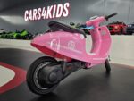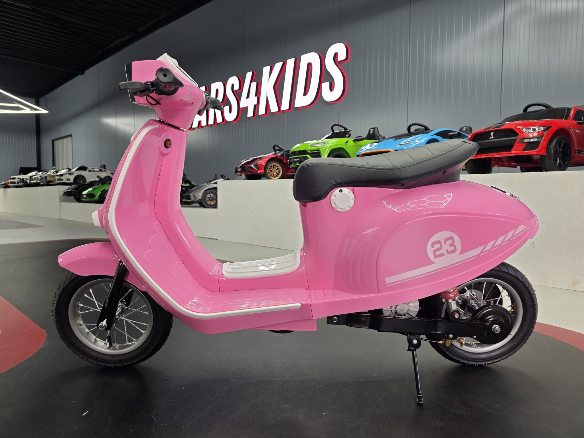 Pink 24V electric kids scooter with 2 batteries, 2 speeds, pneumatic tyres, and a handbrake. Ideal for outdoor play for children aged 6 and up.