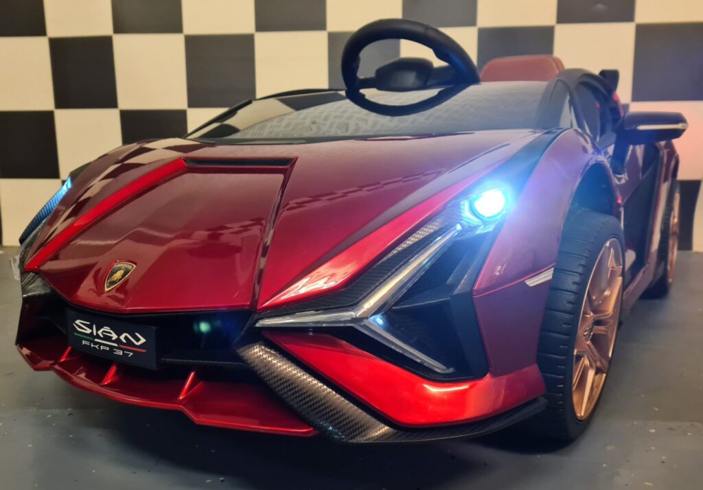 This Lamborghini Sian children’s car is equipped with front and rear lighting, rubber (eva) tires and a leather seat. Suitable for children from 3 years old (due to the use of small parts)