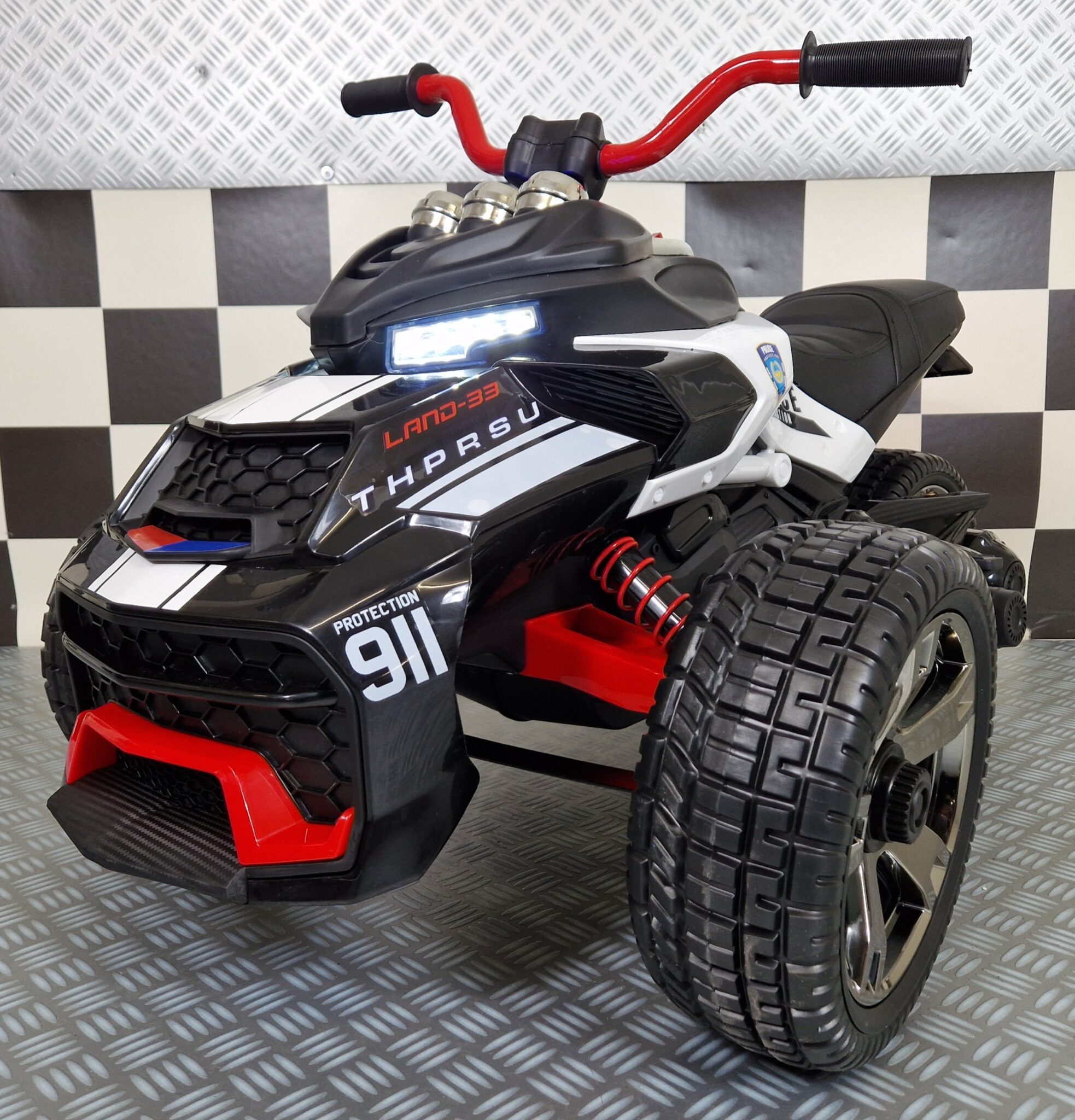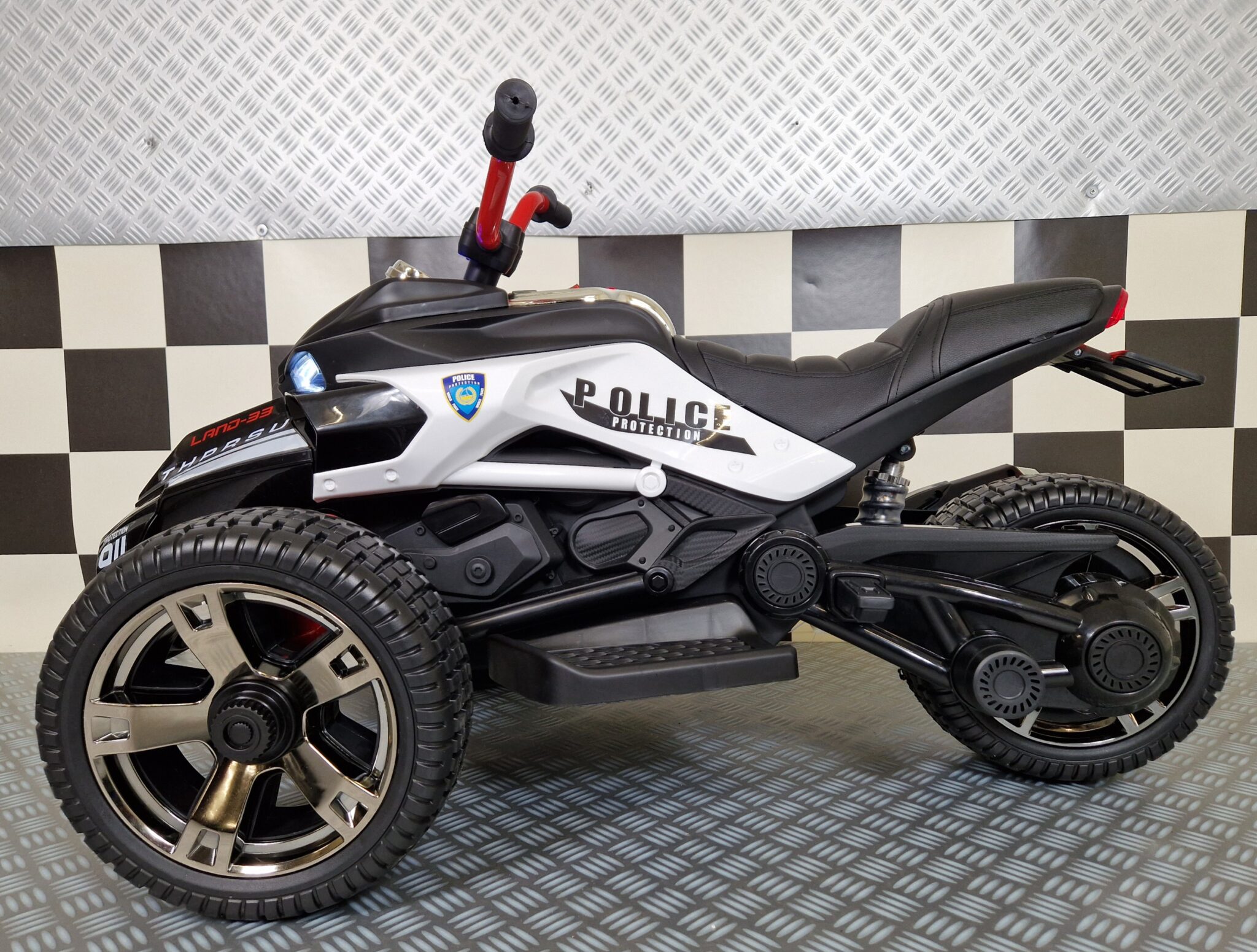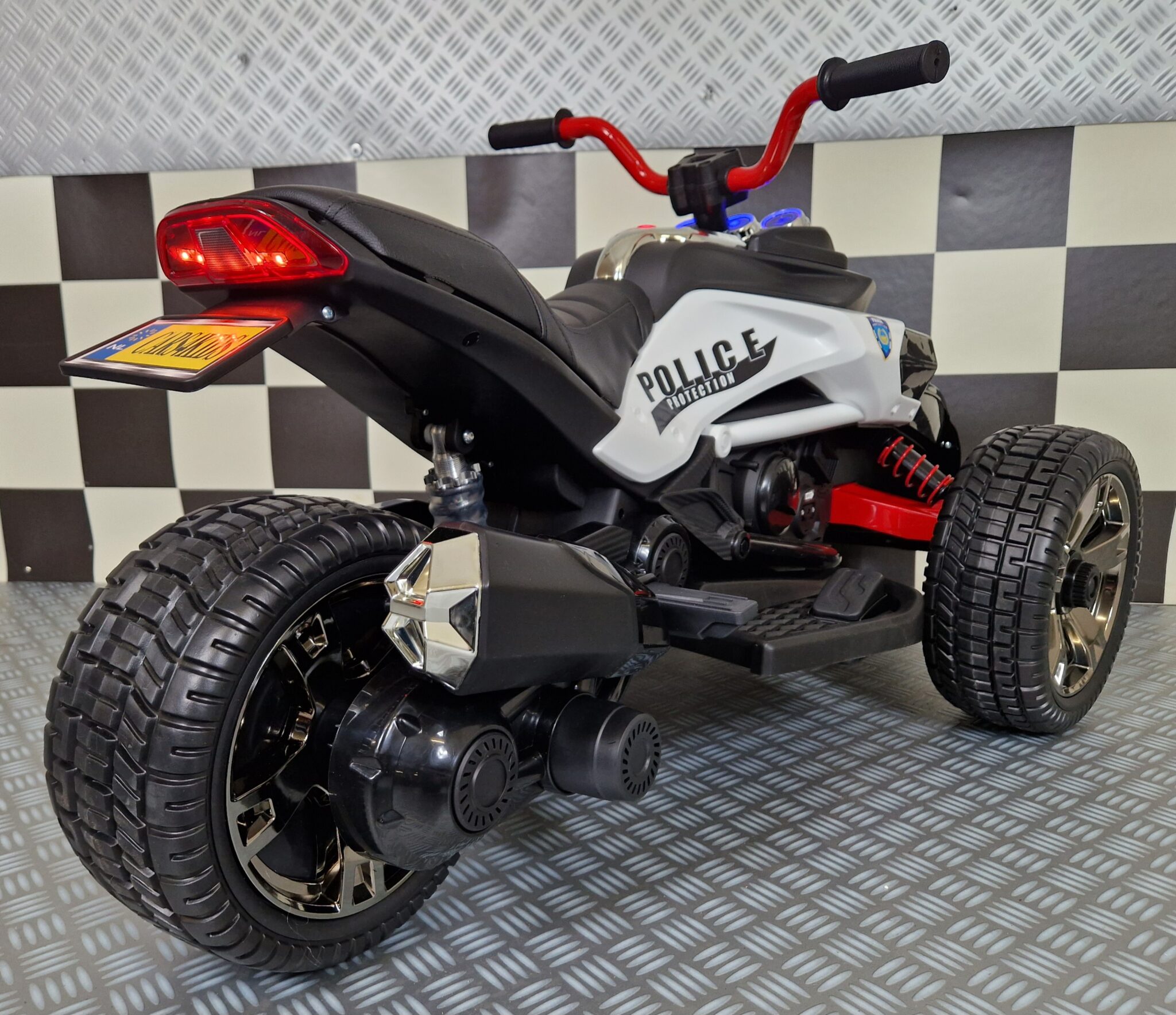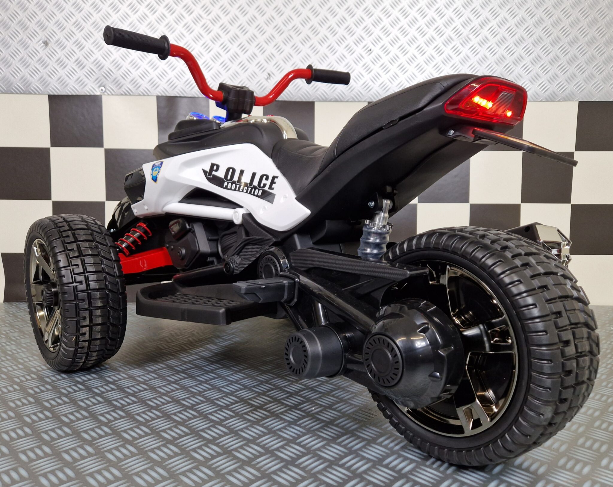 This Spyder police children’s motorcycle is equipped with 2 front wheels and 1 rear wheel. Suitable for children from 3 to about 5 years old.