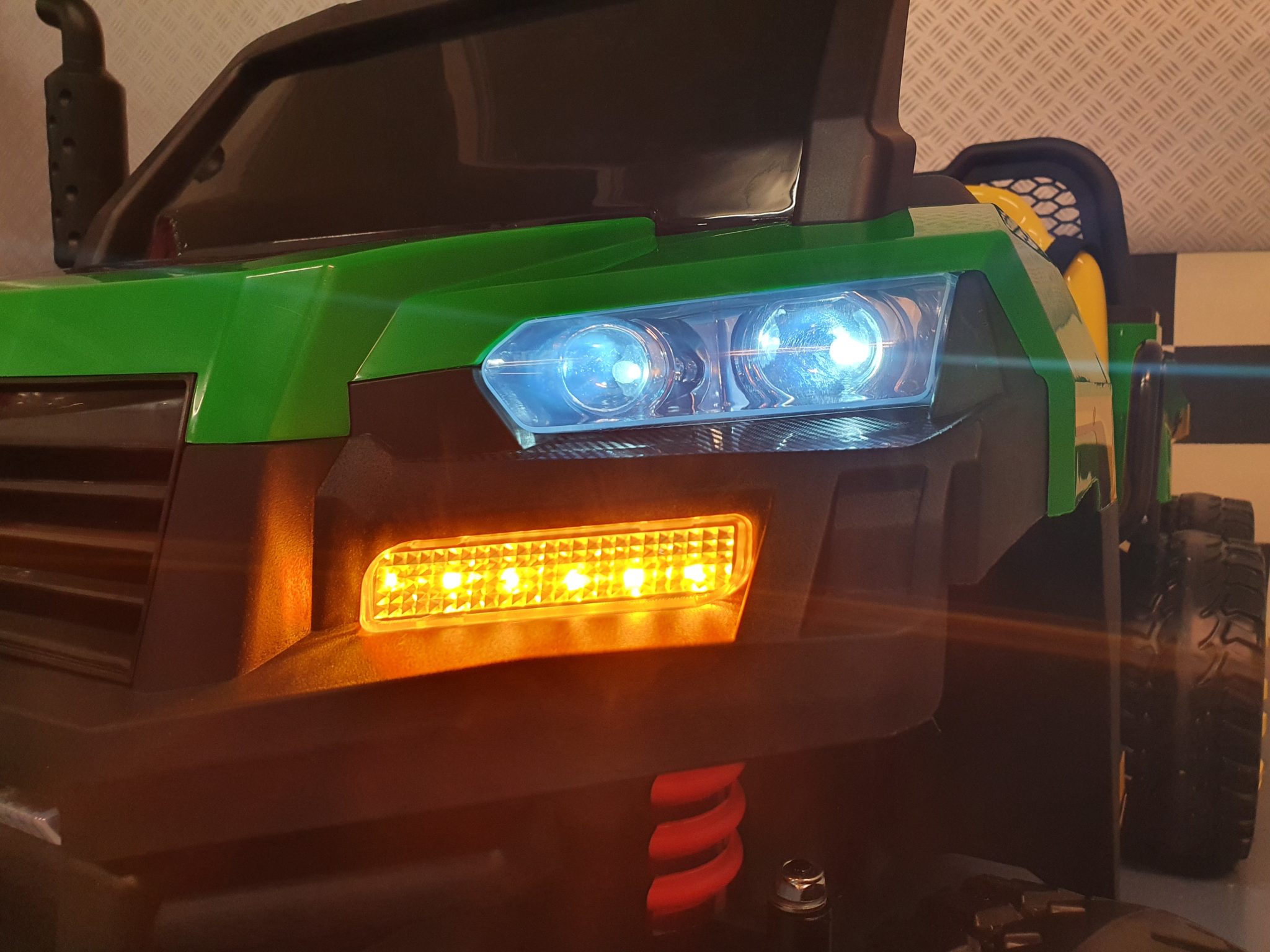 This powerful 1.5 persons Farmer Gator children jeep has 2×12 volt batteries, four motors and six wheels. Suitable for children aged 3 years (due to using small parts). Now equipped with a leather seat, photo 7. This product will be shipped in two boxes due to weight and size restrictions. Therefor there will be two times shipping cost calculated.